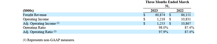 “For the quarter, Managed Freight’s freight revenue decreased 29.3%, from the prior year quarter. Operating income and adjusted operating income declined 88.5% compared to the first quarter of 2022, primarily due to reduced freight revenue attributable to reduced volumes of overflow freight from both Expedited and Dedicated truckload operations and an approximately $2.0 million charge as a result of current period cargo insurance claims. Revenue and operating income in this segment are expected to fluctuate with changes in the freight market and our percentage of contracted versus non-contracted freight.”