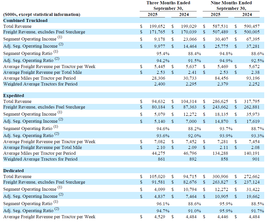 “We continued to invest in and grow within certain industries that our dedicated fleet services with new start-up contracts, which weighed on third quarter margins but are expected to improve over time. Meanwhile, we continue to evaluate contracts in the rest of our Truckload business for improvement or exit. Overall, we expect modest contraction in our combined Truckload fleet and growth in our asset light segments as we allocate capital toward better returning business units. This process may impact quarterly financial results as we grow and shrink certain segments, adjust staffing needs, and dispose of equipment in potentially volatile used equipment markets.