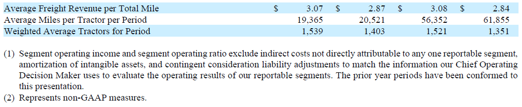 (1) See GAAP to Non-GAAP Reconciliation in the schedules included with this release. In addition to operating income, segment operating income, operating ratio, segment operating income, net income, and earnings per diluted share, we use adjusted operating income, adjusted segment operating income, adjusted operating ratio, adjusted segment operating ratio, adjusted net income, and adjusted earnings per diluted share, non-GAAP measures, as key measures of profitability. Adjusted operating income, adjusted segment operating income, adjusted operating ratio, adjusted segment operating ratio, adjusted net income, and adjusted earnings per diluted share are not substitutes for operating income, segment operating income, operating ratio, segment operating income, net income, and earnings per diluted share measured in accordance with GAAP. There are limitations to using non-GAAP financial measures. We believe our presentation of these non-GAAP financial measures are useful because it provides investors and securities analysts with supplemental information that we use internally for purposes of assessing profitability. Further, our Board and management use non-GAAP operating income, segment operating income, operating ratio, segment operating income, net income, and earnings per diluted share measures on a supplemental basis to remove items that may not be an indicator of performance from period-to-period. Although we believe that adjusted operating income, adjusted segment operating income, adjusted operating ratio, adjusted segment operating ratio, adjusted net income, and adjusted earnings per diluted share improves comparability in analyzing our period-to-period performance, they could limit comparability to other companies in our industry, if those companies define such measures differently. Because of these limitations, adjusted operating income, adjusted segment operating income, adjusted operating ratio, adjusted segment operating ratio, adjusted net income, and adjusted earnings per diluted share should not be considered measures of income generated by our business or discretionary cash available to us to invest in the growth of our business. Management compensates for these limitations by primarily relying on GAAP results and using non-GAAP financial measures on a supplemental basis.