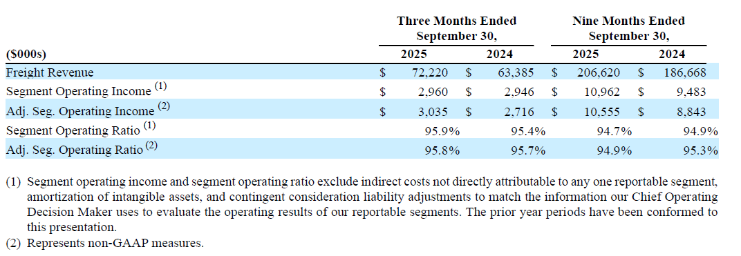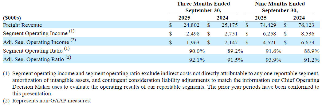 “For the quarter, Managed Freight’s freight revenue increased 14.0%, from the prior year quarter. Operating income improved 0.4% and adjusted operating income improved 11.7% compared to the third quarter of 2024. The growth in this segment is attributable to new business awarded in the year by a large customer that will no longer continue in the fourth quarter.”